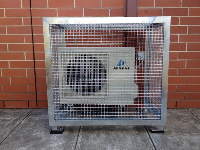 Custom-fabricated steel AC condenser cages designed to protect valuable equipment while maintaining airflow, access, and compliance with site requirements.