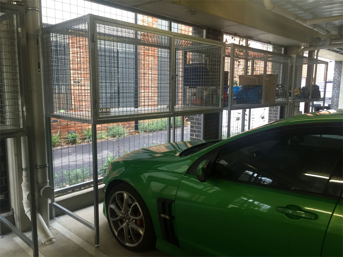 Standard over bonnet storage cages and compartments designed to maximise unused space above vehicle bays in basement and strata car parks, available in weldmesh (cage) or sheeted (compartment) infill options with secure lockable access and galvanised steel construction.